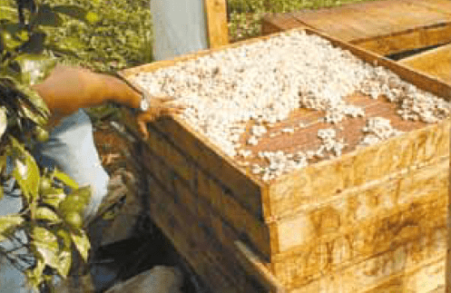 The drying of the cocoa is done in wooden boxes, shakers or concrete